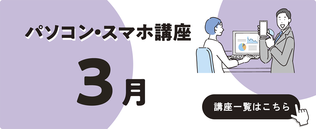 3月開催のパソコン入門・初級講座、スマホ入門・初級講座、パソコン創作講座です。 ...